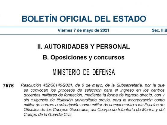 Se ha publicado la Resolución 452/38146/2021, de 6 de mayo, de la Subsecretaría, por la que se convocan los procesos de selección para el ingreso en los centros docentes militares de formación, mediante la forma de ingreso directo, con y sin exigencia de titulación universitaria previa, para la incorporación como militar de carrera o adscripción…
