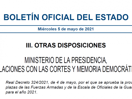 Se ha publicado el Real Decreto 324/2021, de 4 de mayo, por el que se aprueba la provisión de plazas para las Fuerzas Armadas y de la Escala de Oficiales de la Guardia Civil. Descarga