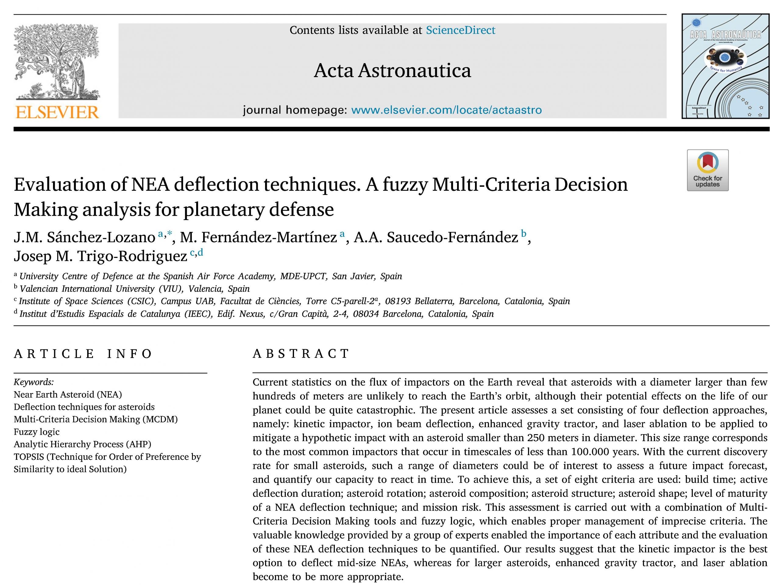 Los profesores del Centro Universitario de la Defensa de San Javier, Juan Miguel Sánchez Lozano y Manuel Fernández Martínez, junto con el investigador Ángel Saucedo y el astrofísico Josep M. Trigo Rodríguez, científico titular del CSIC en el Instituto de Ciencias del Espacio y miembro del Instituto de Estudios Espaciales de Cataluña (IEEC), han realizado un estudio denominado “Evaluation of NEA deflection techniques. A fuzzy Multi-Criteria Decision Making analysis for planetary defense” publicado el 2 de julio en la prestigiosa revista Acta Astronautica, referente mundial en el ámbito de la ingeniería aeroespacial.