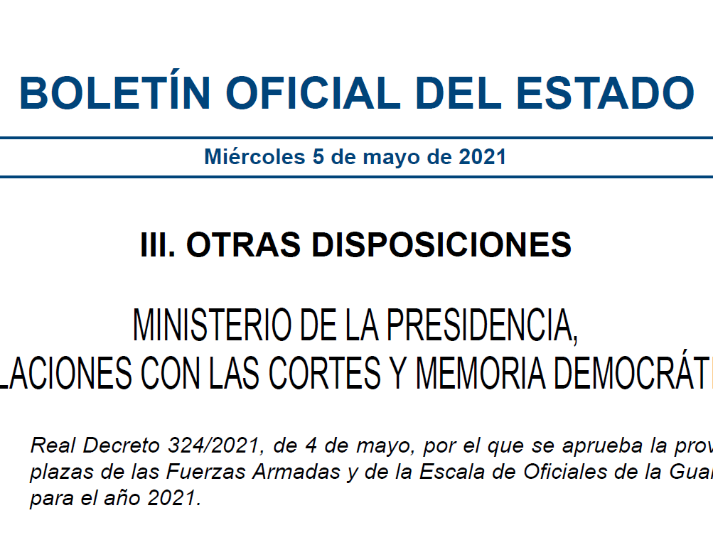 Se ha publicado el Real Decreto 324/2021, de 4 de mayo, por el que se aprueba la provisión de plazas para las Fuerzas Armadas y de la Escala de Oficiales de la Guardia Civil.