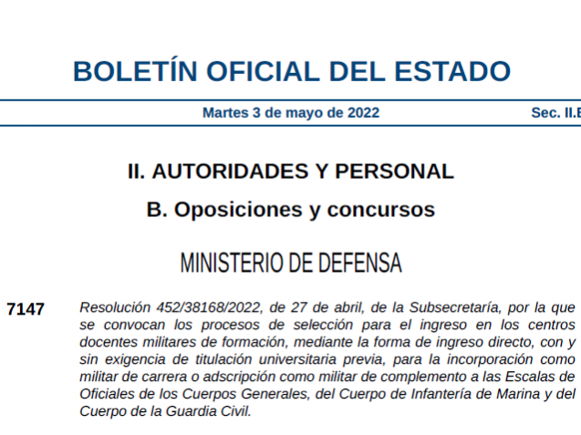 Resolución 452/38168/2022, de 27 de abril, de la Subsecretaría, por la que se convocan los procesos de selección para el ingreso en los centros docentes militares de formación, mediante la forma de ingreso directo, con y sin exigencia de titulación universitaria previa, para la incorporación como militar de carrera o adscripción como militar de complemento a las Escalas de Oficiales de los Cuerpos Generales, del Cuerpo de Infantería de Marina y del Cuerpo de la Guardia Civil
